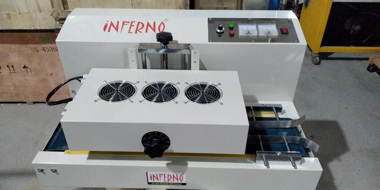 Continuous Induction Sealer For food processing Industry Continuous Induction Sealer: Continuous Induction Sealers are the advance model of manual hand held induction sealers. Continuous Induction Sealers also do the same process of electro magnetically sealing the aluminium wads over the bottles but with less or zero manual intervention. The Continuous Induction Sealer is equipped with a conveyor belt and triple magnetic coils. Here the process is not start and stop but continuous flow. The bottle with wad inside will be placed at the feeding end of the conveyor. The the conveyor of the continuous induction Sealer Pulls the bottle into the machine and passes the same. And then in the process, the aluminium foil gets sealed and then the bottle comes out of the machine. The Continuous Induction Sealer Could Be used in line as well as Standalone.